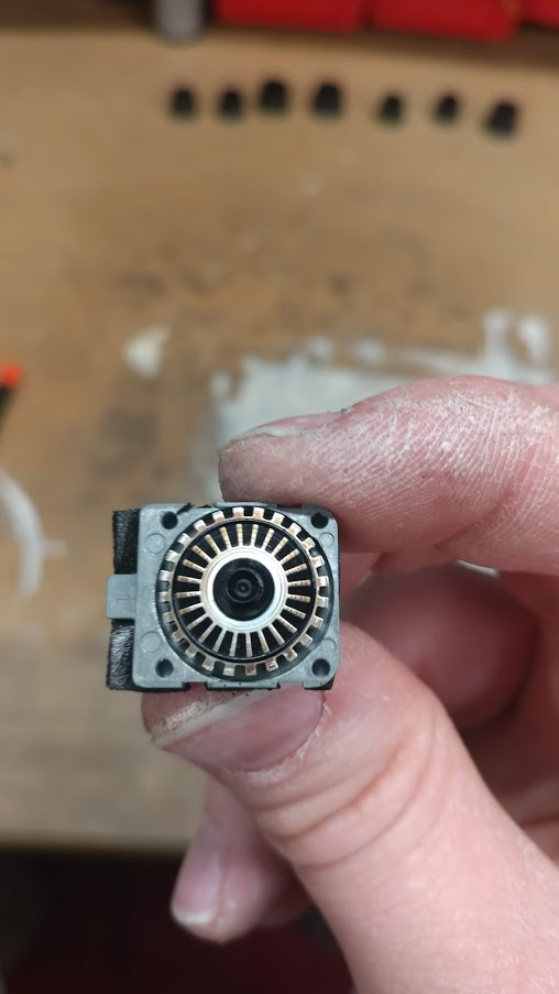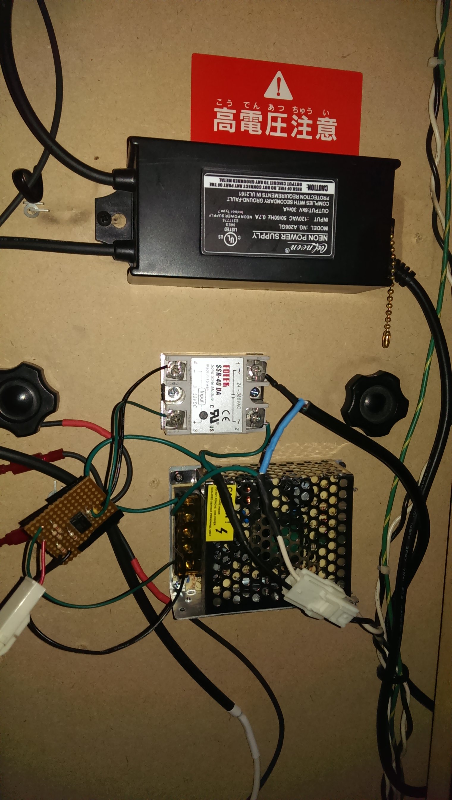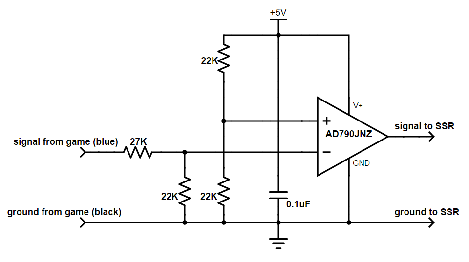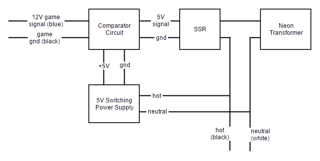 voltage = 11.24 - (0.182 * setting) fits the behavior almost exactly. The problem with this signal is that the neons have to be on when the voltage is less than some amount and off when they are greater than some amount. Passive SSRs only switch on when a voltage exceeds their threshold, so wiring directly to an SSR will get you neons which are inverted.I tried inverting the output signal from the SSR using a mechanical AC relay using the normally closed connections. This worked, but there was a loud click from the relay whenever the neon was switched on or off, and there was a small delay (on the order of 10s of milliseconds) between the game wanting to switch the neons and the neons actually switching. For a rhythm game where the neons flash to the beat, this wasn't acceptable. In order to do the logic conversion on the signal line, there needs to be DC power (12V or 5V doesn't matter since you can use a simple voltage divider to convert the signal from the game to whatever range you want). I didn't want to run a line from the power supply in the game up to the speakers because it would add additional non-standard connectors to the speaker connections and make it harder to disassemble or move the game. So I decided on purchasing small 5V switching regulated power supplies and connecting them to the AC line used to power the neons. Then, I divided the game voltage from 12V to 5V using a resistors and fed that to a comparator circuit as included above. Using the 5V from the power supply to power the circuit as well as provide the reference voltage to compare allowed me to use the trim pot on the power supply to adjust the circuit to turn on at exactly 32 and off at exactly 31 in the service menu. A block diagram of this setup is included above.Note that with this approach, you want to tune both sides so that when 32 is selected in the game the indicator light on the SSR is fully lit, and when 31 is selected the indicator is fully extinguished. If it is partially lit, you might get flickering at that value. Also, since the game attempts to use the dimming feature, if you have the thresholds set differently, the neons will come on and turn off at slightly different times which doesn't look as good. Also note that it is recommended to use the same neon transformer on both sides or the electrical characteristics of different neon transformers could also cause the neons to flash slightly out of sync from each other. For my conversion, I used two CoolNeon NG.A206GL 6kV 30mA neon transformers. The final result can be seen above. I used the original connectors from broken original transformers to avoid chopping up the wiring inside the speakers.