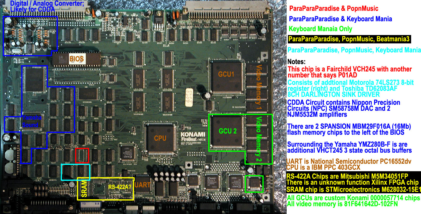 Composite Firebeat mainboard image. The base image is from Keyboard Mania. The other boards that have unique chips have that information highlighted and annotated.